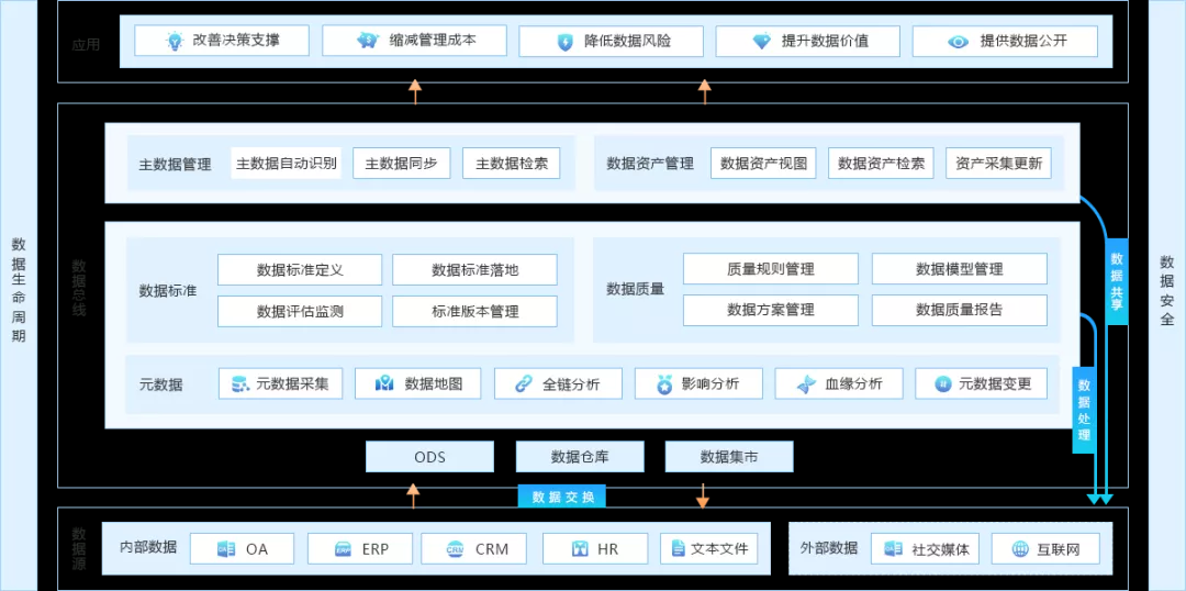 数据资产管理、数据安全管理、数据交换管理、数据处理管理、数据生命周期管理等九大功能模块的