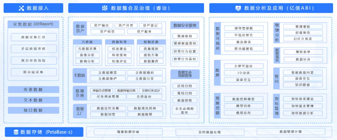 i@Report;基于hadoop框架开发的企业级实时大数据平台——PetaBase-s;覆盖数据全生命周期管理的应用平台——睿治;融合了ETL数据处理、数据建模、